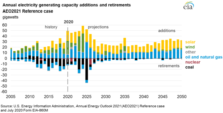 Put another way, there will be a number of coal, oil and natural gas, and nuclear power units retired, but a significant amount of solar, wind, and new natural gas facilities will be needed.